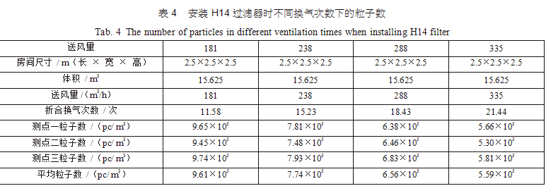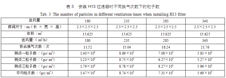 在空調(diào)機(jī)房中新建了三間2.5m×2.5m×2.5m的潔凈間,從空調(diào)主風(fēng)管引風(fēng),每支支管設(shè)置調(diào)節(jié) 閥,并設(shè)排風(fēng)機(jī)進(jìn)行全排,送回風(fēng)口及測點(diǎn)布置分別如圖 3(每點(diǎn)取樣三次,取平均值)。考慮到初中效過濾器對最后潔凈度的影響和最后理論塵埃數(shù)量 計(jì)算的方便,試驗(yàn)用初中效繼續(xù)分別為G4、F8,三個房間分別安裝高效過濾器,風(fēng)量500m3/h,第一組數(shù)據(jù)為送風(fēng)量按GMP 驗(yàn)證指南推薦換氣次數(shù)保持不變,分別用H12、H13、H14、U15過濾器,第二組數(shù)據(jù)為采用H13高效過濾器,調(diào)節(jié)風(fēng)量 ;第三組數(shù)據(jù)為采用H14高效過濾器,調(diào)節(jié)風(fēng)量,分別測得塵埃粒子數(shù),并列表得出不同的換氣次數(shù)下對應(yīng)的塵埃數(shù)如表2、表3、表4。