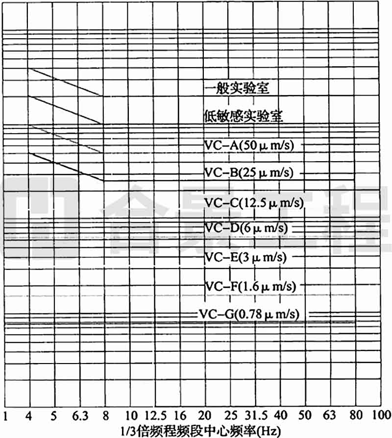 A.0.1 拉絲塔的容許振動參數(shù)可按精密設備、儀器容許振動通用標準曲線(圖A.0.1)中VC-B(25μm/s)曲線確定。